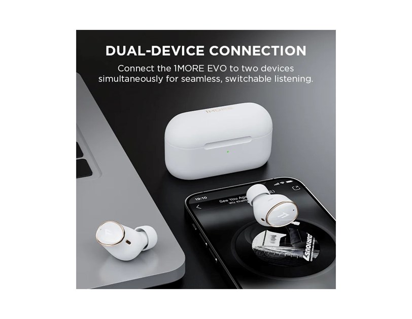 - 1MORE EVO can be connected with two devices simultaneously and effortlessly switch between music, online meetings, videos, and calls on the two connected devices
