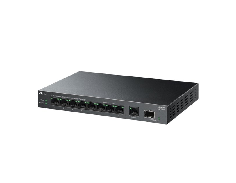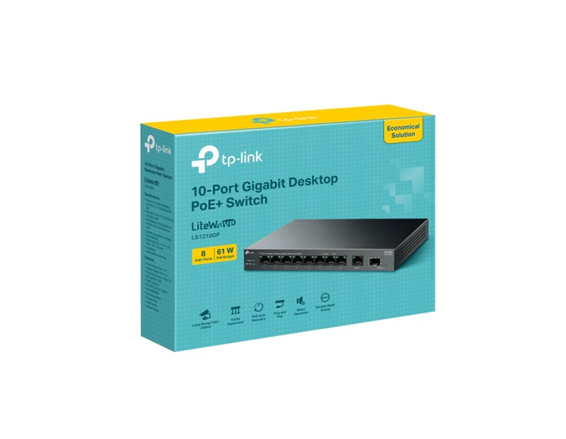 TP-Link 9-port LS1210GP desktop preklopnik, 61W PoE, 9×10/100/1000 Mbps RJ45 ports (1-8 port PoE+) 1× Gigabit SFP Port, do 250m PoE prijenos, Plug&play, metalno kućište