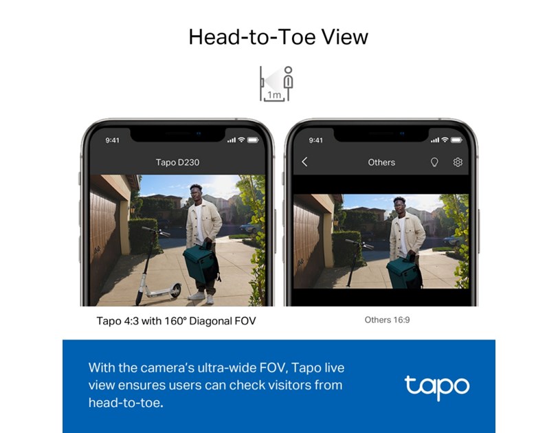 - With the camera’s ultra-wide FOV(160° Diagonal), Tapo 4:3 live view ensures users can check visitors from head-to-toe as close as 1m†, which shows more vertical details than other 16:9 doorbells'.