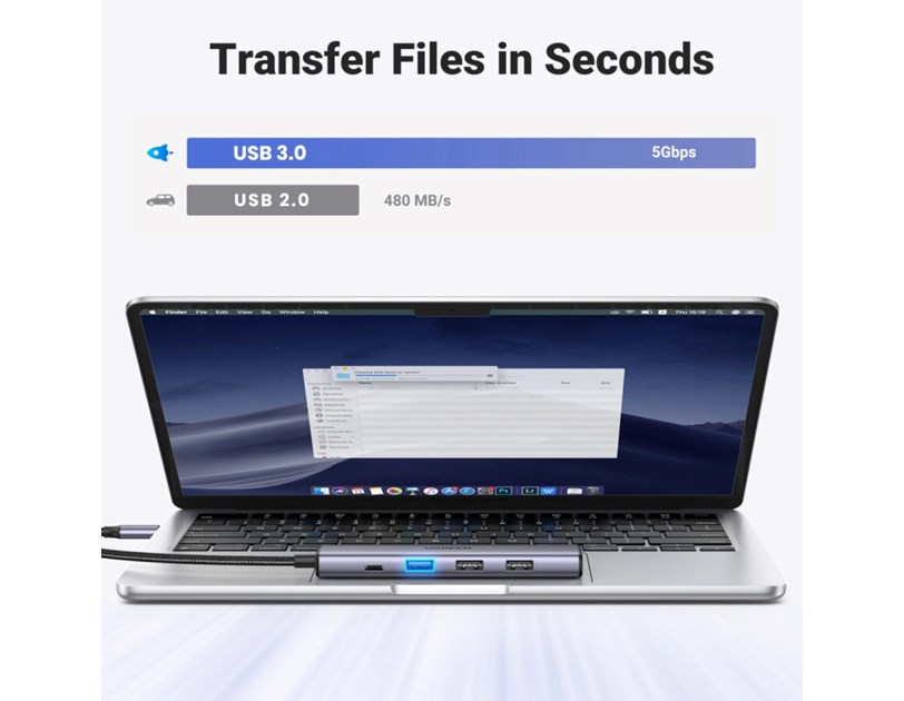 - UGREEN USB C Hub ima 100 W USB-C PD priključak za brzo punjenje prijenosnog računala kod kuće ili u pokretu.