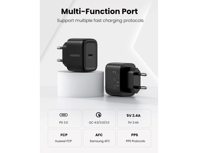 UGREEN zidni punjač 25W, USB-C, PD3.0/QC4.0, crni + USB-C/USB-C kabel 2.0m