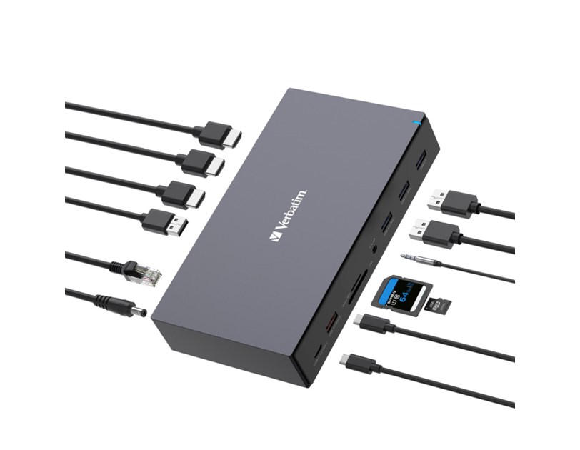 - Verbatimova priključna stanica sa 17 priključaka ima više priključaka za monitore, olakšavajući složene postavke s više zaslona s lakoćom. S pet USB-A priključaka i USB-C priključkom, savršen je za povezivanje mnoštva stolnih dodataka, od miševa i tipkovnica do USB pogona i vanjskih tvrdih diskova. Ostanite povezani uz RJ45 priključak za žično mrežno povezivanje, dok SD i microSD priključci zadovoljavaju različite zahtjeve memorijskih kartica.
